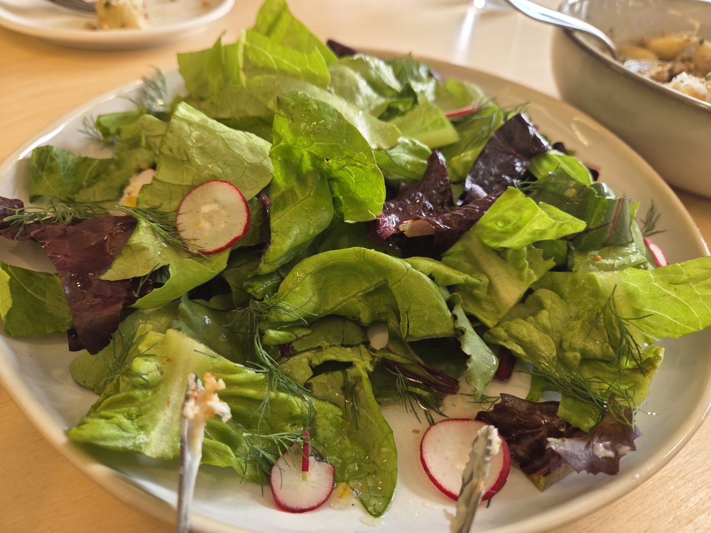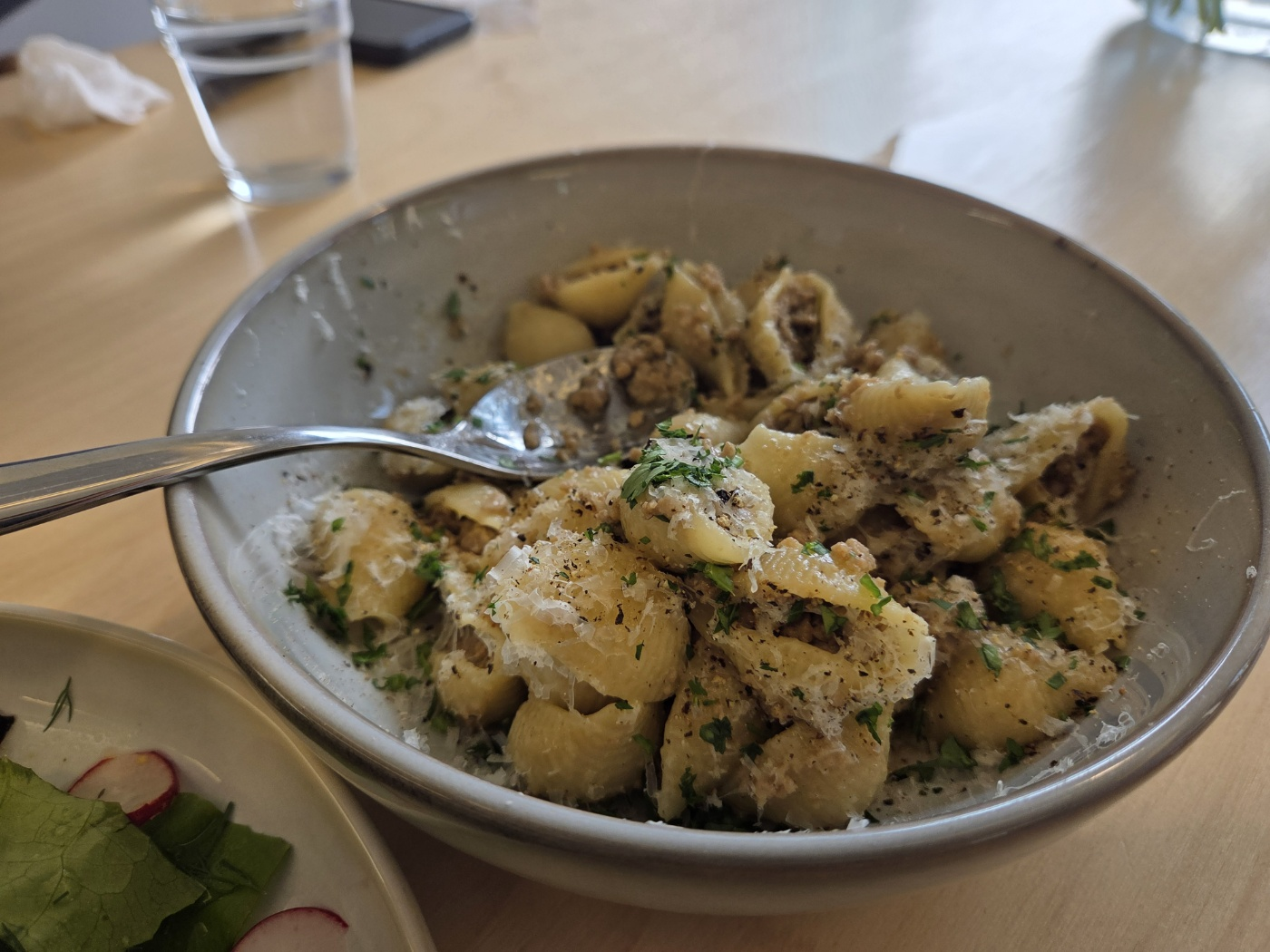 화이트와인과 레드와인 1병을 3명이 나누어 마셨습니다. 소라 처럼 생긴 모양의 콘킬리에 화이트 라구 파스타를 먼저 맛 보았습니다. 신선한 재철 재료로 만든 '오늘의 스페셜 메뉴'와 '오늘의 샐러드'가 나왔습니다.